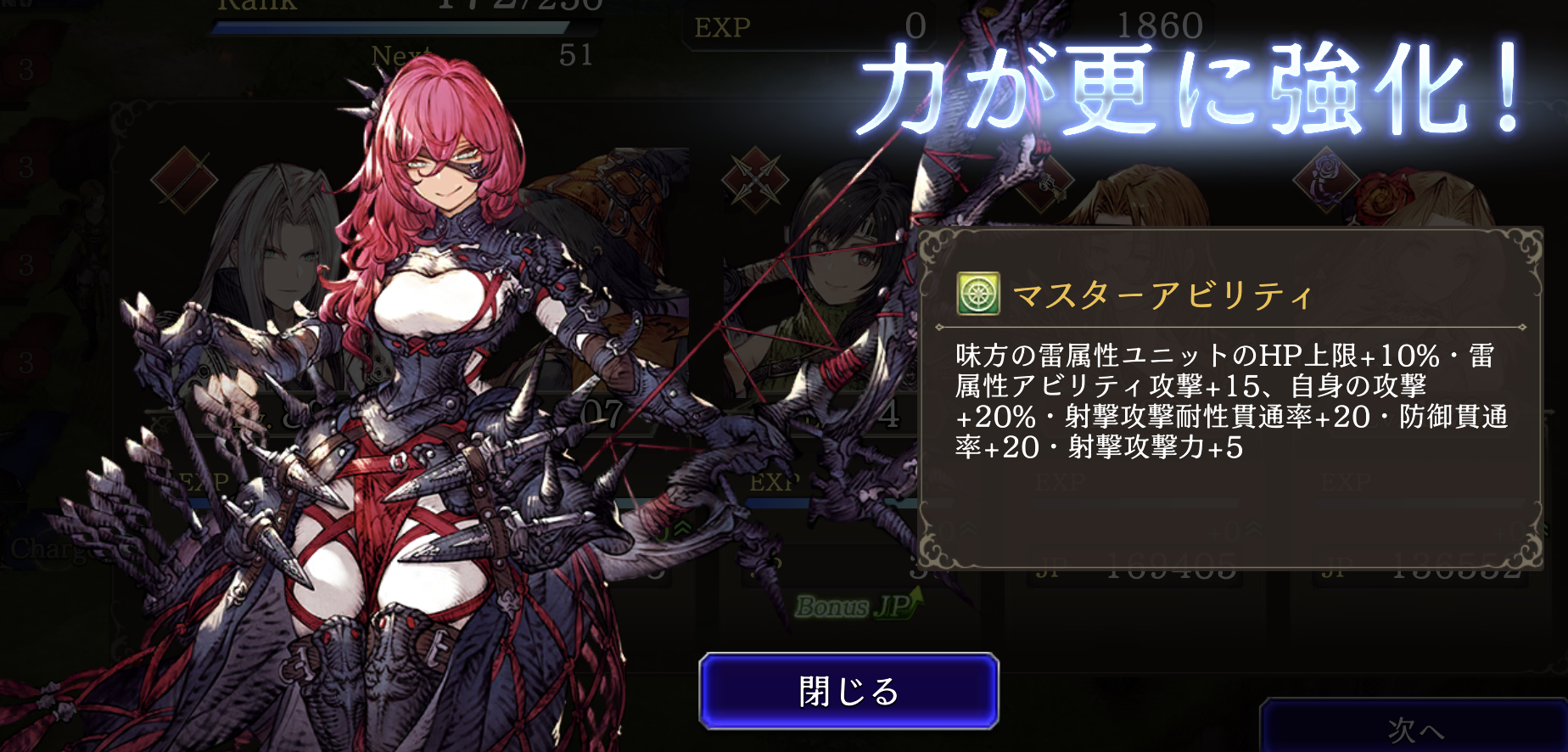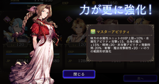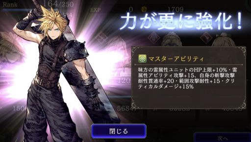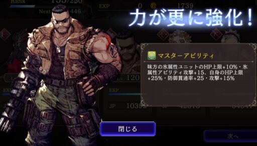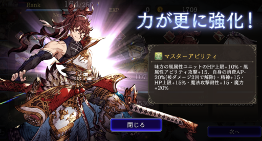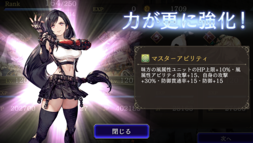 ![]() 味方の風属性ユニットのHP上限+10%・風属性アビリティ攻撃+15、自身の精神+5、HP+15% ⇩ ⇩ 味方の風属性ユニットのHP上限+10%・風属性アビリティ攻撃+15、自身のHP上限+15%、精神+15、消費AP-20%(被ダメージ2回で解除)、魔法攻撃耐性+15、魔力+20% |