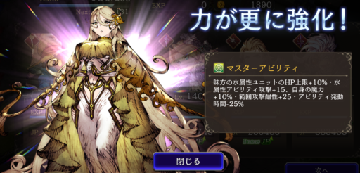 ![]() 味方の水属性ユニットのHP上限+10%・水属性アビリティ攻撃+15、自身の範囲攻撃耐性+15 ⇩ ⇩ 味方の水属性ユニットのHP上限+10%・水属性アビリティ攻撃+15、自身の範囲攻撃耐性+25、魔力+10%、アビリティ発動時間-25% |