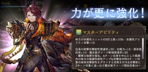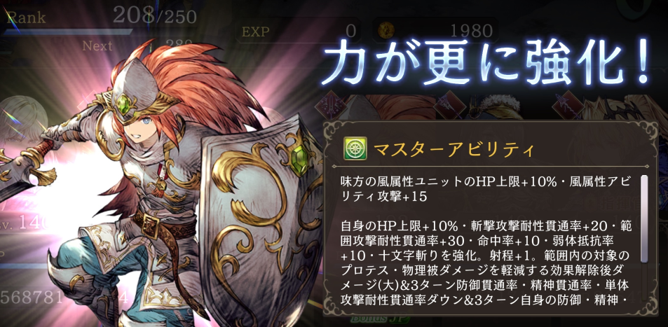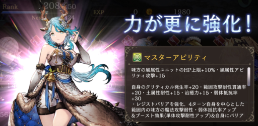 ![]() 味方の風属性ユニットのHP上限+10%・風属性アビリティ攻撃+15 自身のクリティカル率+20・土耐性+15 ⇩MA2&3強化⇩ 味方の風属性ユニットのHP上限+10%・風属性アビリティ攻撃+15 自身のクリティカル率+20・範囲貫通+20・土耐性+15・治癒力+15・弱体抵抗率+30 | ||