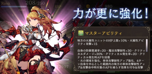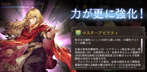 ![]() 味方の火属性ユニットのHP上限+10%・火属性アビリティ攻撃+15 自身の防御貫通+20、魔法耐性+30、クリティカルダメージ+20、クリティカル時AP+5回復 ⇩MA強化⇩ 味方の火属性ユニットのHP上限+10%・火属性アビリティ攻撃+15 自身の防御貫通+20、魔法耐性+30、クリティカルダメージ+20、クリティカル発生率+20%、クリティカル時AP+5回復 | ||