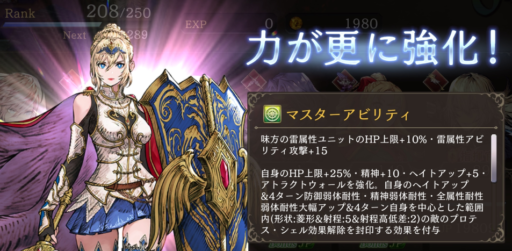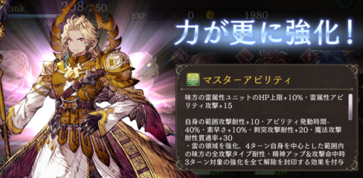 ![]() 味方の雷属性ユニットのHP上限+10%・雷属性アビリティ攻撃+15 自身の範囲攻撃耐性+10、アビリティ発動時間-20%、素早さ+10%、刺突耐性20、魔法貫通+15 ⇩MA強化⇩ 味方の雷属性ユニットのHP上限+10%・雷属性アビリティ攻撃+15 自身の範囲攻撃耐性+10、アビリティ発動時間-40%、素早さ+10%、刺突耐性20、魔法貫通+30 | ||