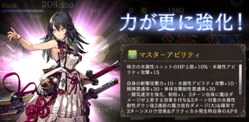 ![]() 味方の水属性ユニットのHP上限+10%・水属性アビリティ攻撃+15 自身の斬撃攻撃力+10、水属性アビリティ攻撃+10・精神貫通率+20 ⇩MA強化⇩ 味方の水属性ユニットのHP上限+10%・水属性アビリティ攻撃+15 自身の斬撃攻撃力+10、水属性アビリティ攻撃+10・精神貫通率+30・単体貫通+30 | ||