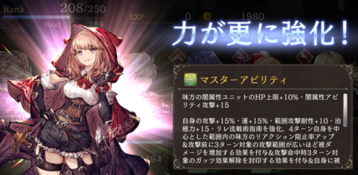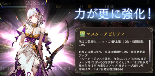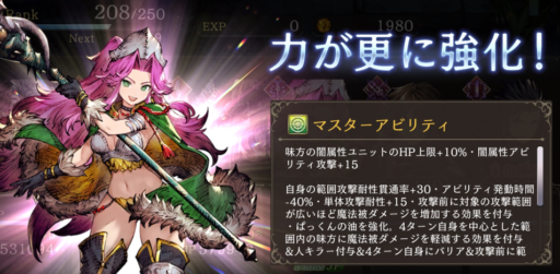 ![]() 味方の闇属性ユニットのHP上限+10%・闇属性アビリティ攻撃+15 自身の攻撃+15%、運+15%、範囲耐性+10、治癒力+15 ⇩MA3強化⇩ 変化なし | ||