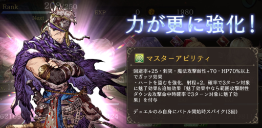 | ①「火の領域」 効果4ターンに、単体耐性+15→25に 攻撃命中時、AP15%ダメージ ヘイスト&AP自動回復解除 自身にガッツ&攻撃命中時CTアップ無効化 ②「破鎧焼尽弓」 物理スパイク破壊、ブースト解除追加 | ||
