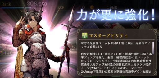 ![]() 味方の光属性ユニットのHP上限+10%・光属性アビリティ攻撃+15 自身の精神+10、素早さ+10%、闇耐性+20 ⇩MA3強化⇩ 変化なし | ||