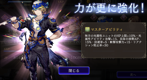 ![]() 味方の光属性ユニットのHP上限+10%・光属性アビリティ攻撃+15、自身の消費AP-15%、回避率+5% ⇩ ⇩ 味方の光属性ユニットのHP上限+10%・光属性アビリティ攻撃+15、自身の消費AP-15%、回避率+5%、斬撃攻撃力+15、リアクション阻止率+30 |