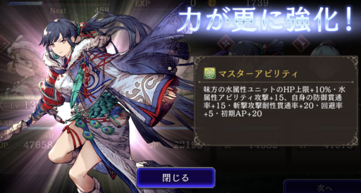 ![]() 味方の水属性ユニットのHP上限+10%・水属性アビリティ攻撃+15、自身の斬撃攻撃力+10 ⇩ ⇩ 味方の水属性ユニットのHP上限+10%・水属性アビリティ攻撃+15、自身の斬撃攻撃力+10、水属性アビリティ攻撃+10・精神貫通率+20 |