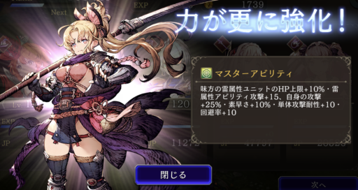 ![]() 味方の雷属性ユニットのHP上限+10%・雷属性アビリティ攻撃+15、自身の単体攻撃耐性+10、回避率+10 ⇩ ⇩ 味方の雷属性ユニットのHP上限+10%・雷属性アビリティ攻撃+15、自身の攻撃+25%、素早さ+10%、単体攻撃耐性+10、回避率+10 |
