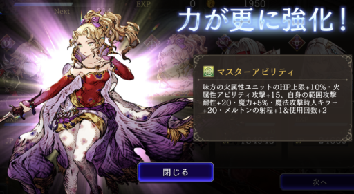 ![]() 味方の火属性ユニットのHP上限+10%・火属性アビリティ攻撃+15、自身の範囲耐性+10、魔力+5% ⇩ ⇩ 味方の火属性ユニットのHP上限+10%・火属性アビリティ攻撃+15、自身の魔力+5%、範囲耐性+10、魔法攻撃時人キラー+20、メルトンの射程+1&使用回数+2 |