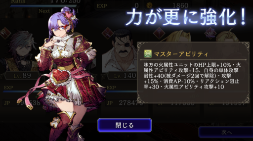 ![]() 味方の火属性ユニットのHP上限+10%・火属性アビリティ攻撃+15、自身の攻撃+15%、消費AP-10% ⇩ ⇩ 味方の火属性ユニットのHP上限+10%・火属性アビリティ攻撃+15、自身の攻撃+15%、消費AP-10%、単体攻撃耐性+40(被ダメージ2回で解除)リアクション阻止率+30・火属性アビリティ攻撃+10 |