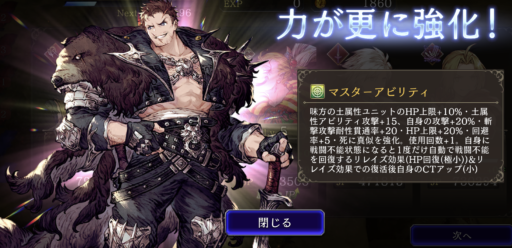 ![]() 味方の土属性ユニットのHP上限+10%・土属性アビリティ攻撃+15、自身の斬撃攻撃貫通率+20、回避率+5 ⇩ ⇩ 味方の土属性ユニットのHP上限+10%・土属性アビリティ攻撃+15、自身の斬撃攻撃貫通率+20、回避率+5、攻撃+20%、HP上限+20、死に真似を強化(使用回数+1、リレイズ復活時CTアップ追加) |
