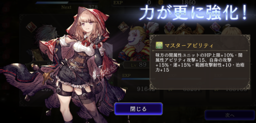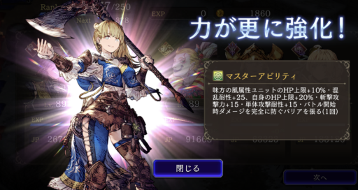 ![]() 味方の風属性ユニットのHP上限+10%・混乱耐性+25、自身のHP上限+20%、斬撃攻撃力+10 ⇩ ⇩ 味方の風属性ユニットのHP上限+10%・混乱耐性+25、自身のHP上限+20%、斬撃攻撃力+15、単体耐性+15、バトル開始時完全バリア(1回) |