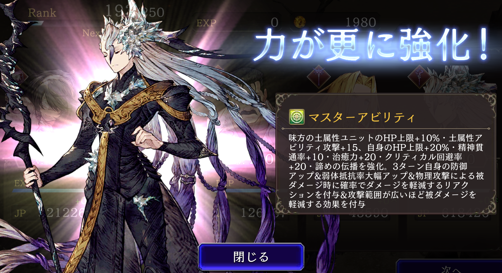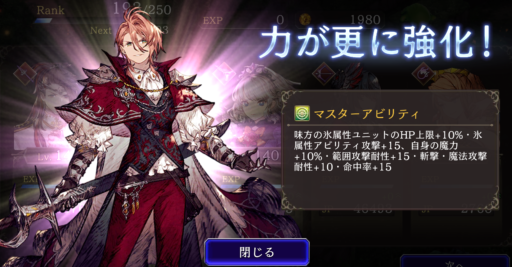 ![]() 味方の氷属性ユニットのHP上限+10%・氷属性アビリティ攻撃+15、自身の魔力+10、範囲攻撃耐性+15 ⇩ ⇩ 味方の氷属性ユニットのHP上限+10%・氷属性アビリティ攻撃+15、自身の魔力+10、範囲攻撃耐性+15、斬撃・魔法攻撃耐性+10、命中率+15 |