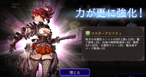 ![]() 味方の水属性ユニットのHP上限+10%・魅了耐性25、自身の精神貫通率+10・獲得AP+30%・火属性キラー20 ⇩ ⇩ 味方の水属性ユニットのHP上限+10%・魅了耐性25、自身の精神貫通率+30・獲得AP+30%・火属性キラー20・魔法被ダメージ軽減10% |