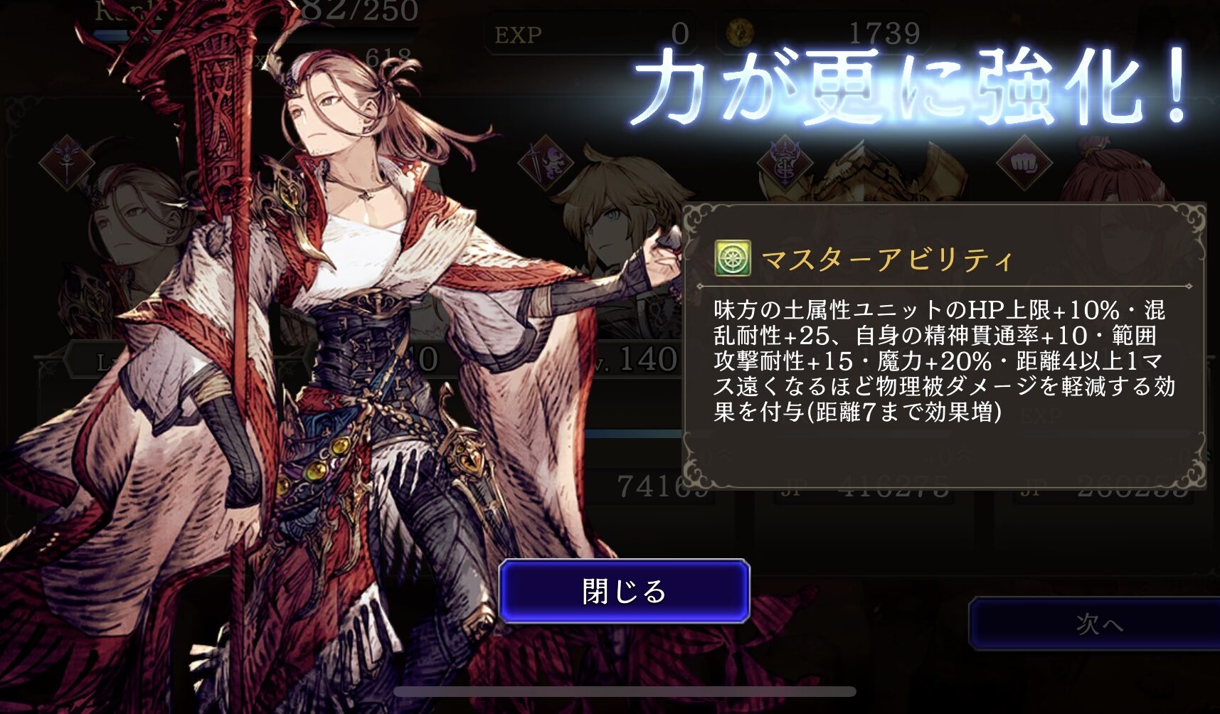 ![]() 味方の土属性ユニットのHP上限+10%・混乱耐性+25、自身の精神貫通率+10 、範囲耐性+15 ⇩ ⇩ 味方の土属性ユニットのHP上限+10%・混乱耐性+25、自身の精神貫通率+10 、範囲耐性+15・魔力+20%、距離4マス以上1マス遠くなるほど物理被ダメージ軽減効果付与(射程7マスまで効果増加) |