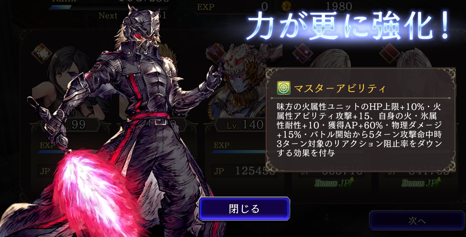 ![]() 味方の火属性ユニットのHP上限+10%・火属性アビリティ攻撃+15、自身の火・氷耐性+10・獲得AP+30% ⇩ ⇩ 味方の火属性ユニットのHP上限+10%・火属性アビリティ攻撃+15、自身の火・氷耐性+10・獲得AP+60%、物理ダメージ+15%・バトル開始から5ターン攻撃命中時3ターン対象のリアクション阻止率ダウン効果付与 |