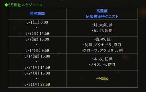 【秘伝書獲得クエスト】5月の開催スケジュール