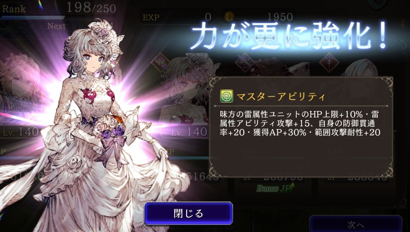 ![]() 味方の雷属性ユニットのHP上限+10%・雷属性アビリティ攻撃+15、自身の防御貫通率+20、獲得AP+30% ⇩ ⇩ 味方の雷属性ユニットのHP上限+10%・雷属性アビリティ攻撃+15、自身の防御貫通率+20、獲得AP+30%、範囲攻撃耐性+20 |