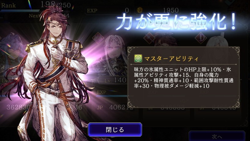 ![]() 味方の氷属性ユニットのHP上限+10%・氷属性アビリティ攻撃+15、自身の魔力+20%、精神貫通率+10 ⇩ ⇩ 味方の氷属性ユニットのHP上限+10%・氷属性アビリティ攻撃+15、自身の魔力+20%、精神貫通率+10、範囲攻撃耐性貫通率+30、物理被ダメージ10軽減 |