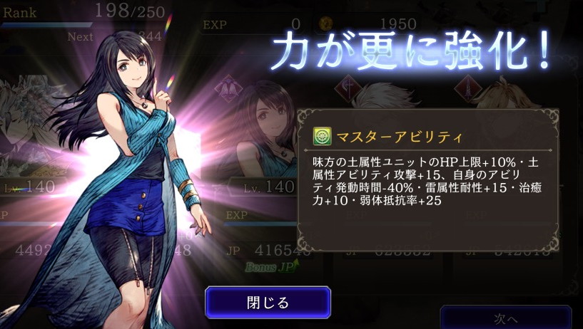 ![]() 味方の土属性ユニットのHP上限+10%・土属性アビリティ攻撃+15、自身のアビリティ発動時間-20%、雷耐性+15 ⇩ ⇩ 味方の土属性ユニットのHP上限+10%・土属性アビリティ攻撃+15、自身のアビリティ発動時間-40%、雷耐性+15、治癒力+10・弱体抵抗率+25 |