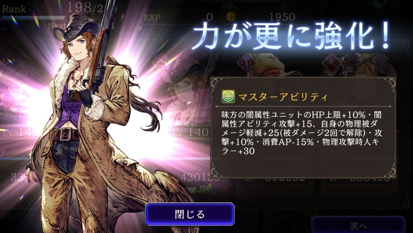 ![]() 味方の闇属性ユニットのHP上限+10%・闇属性アビリティ攻撃+15、自身の攻撃+10%、消費AP-15% ⇩ ⇩ 味方の闇属性ユニットのHP上限+10%・闇属性アビリティ攻撃+15、自身の物理被ダメージ25軽減(被ダメージ2回で解除)・自身の攻撃+10%、消費AP-15%・物理攻撃時人キラー+30 |