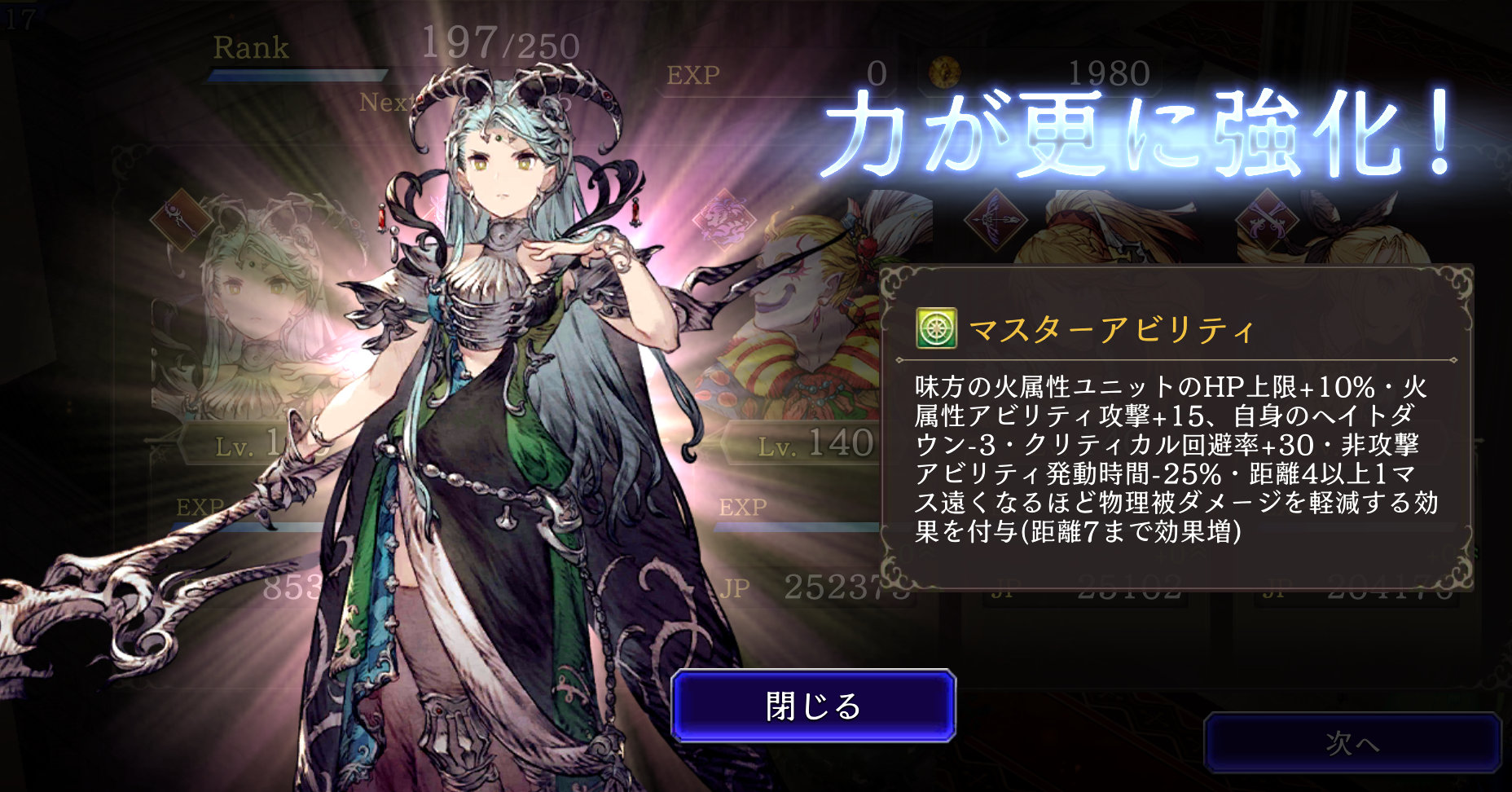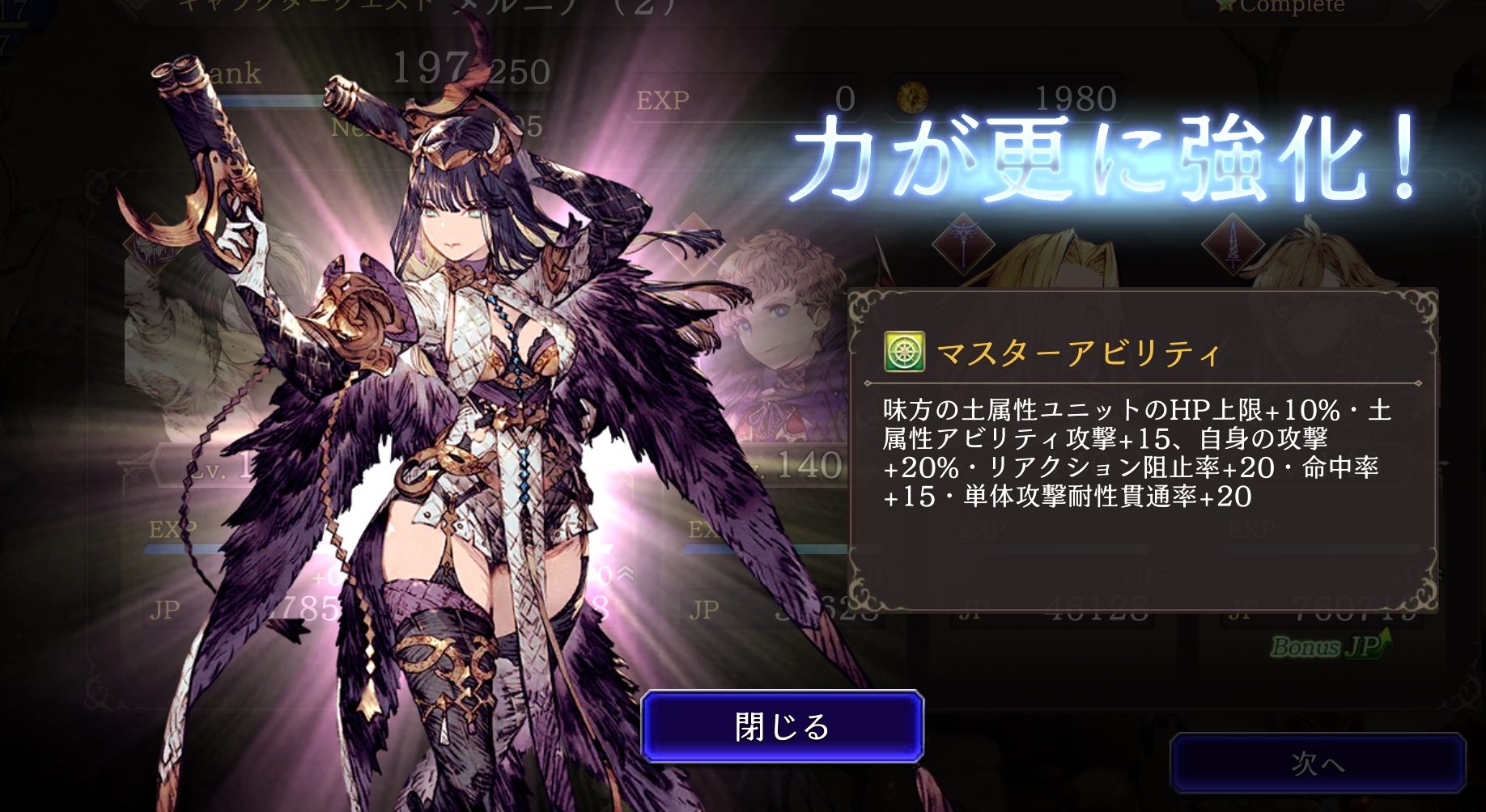 ![]() 味方の土属性ユニットのHP上限+10%・土属性アビリティ攻撃+15、自身の攻撃+20%、リアクション阻止率+20 ⇩ ⇩ 味方の土属性ユニットのHP上限+10%・土属性アビリティ攻撃+15、自身の攻撃+20%、リアクション阻止率+20・命中率+15・単体攻撃耐性貫通率+20 |