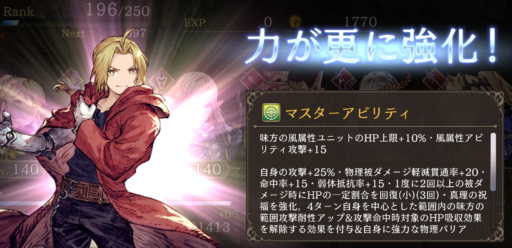 ![]() 味方の風属性ユニットのHP上限+10%・風属性アビリティ攻撃+15 自身の攻撃+25% ⇩MA強化⇩ 味方の風属性ユニットのHP上限+10%・風属性アビリティ攻撃+15 自身の攻撃+25%・物理被ダメ軽減20%・命中率+15・弱体抵抗率+15・1度に2回以上の被ダメ時にHP一定割合回復(小・3回) | ||||