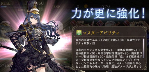 ![]() 味方の風属性ユニットのHP上限+10%・風属性アビリティ攻撃+15 自身のクリティカル発生率+10・単体攻撃耐性+10・弱体抵抗率+20・追加効果「遠くなるほど魔法被ダメ軽減中ならドンムブ係数+0.15」を付与 ⇩MA強化⇩ 味方の風属性ユニットのHP上限+10%・風属性アビリティ攻撃+15 自身のクリティカル発生率+10・単体攻撃耐性+10・弱体抵抗率+20・単体貫通+20・魔法被ダメ軽減貫通+20・追加効果「遠くなるほど魔法被ダメ軽減中ならドンムブ係数+0.15」を付与 | ||