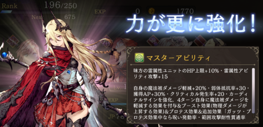 ![]() 味方の雷属性ユニットのHP上限+10%・雷属性アビリティ攻撃+15 自身の魔法ダメージ軽減+10%・弱体抵抗率+15・獲得AP+30% ⇩MA強化⇩ 味方の雷属性ユニットのHP上限+10%・雷属性アビリティ攻撃+15 自身の魔法ダメージ軽減+20%・弱体抵抗率+30・獲得AP+30%・クリティカル発生率+20 | ||