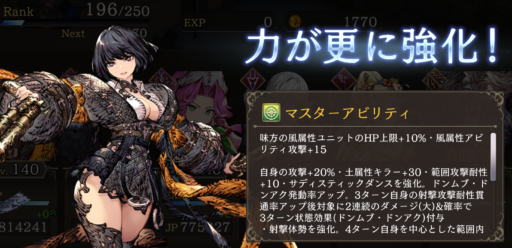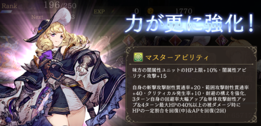 ![]() 味方の闇属性ユニットのHP上限+10%・闇属性アビリティ攻撃+15 自身の斬撃攻撃耐性貫通+20・クリティカル発生率+10 ⇩MA強化⇩ 味方の闇属性ユニットのHP上限+10%・闇属性アビリティ攻撃+15 自身の斬撃攻撃耐性貫通+20・範囲貫通+40・クリティカル発生率+10 | ||