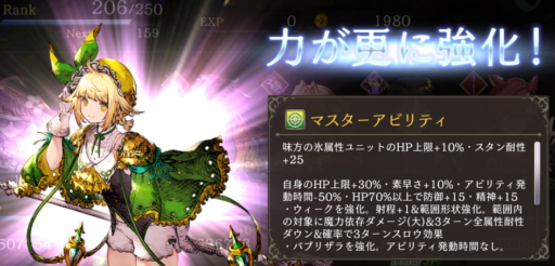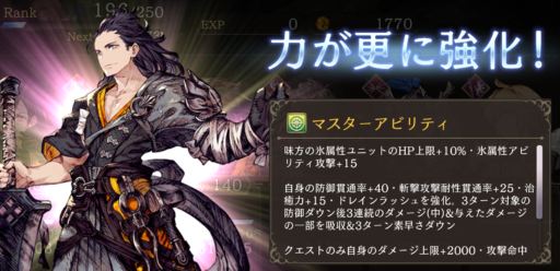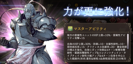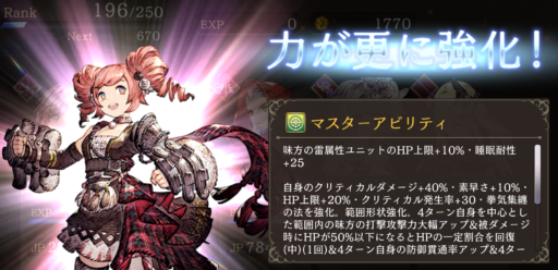 ![]() 味方の雷属性ユニットのHP上限+10%・雷属性アビリティ攻撃+15 自身のHP上限+10%、防御+10 ⇩MA強化⇩ 味方の雷属性ユニットのHP上限+10%・雷属性アビリティ攻撃+15 自身のHP上限+30%・防御+10・全属性耐性+10・弱体抵抗率+15・クリティカル回避率+20 | ||||