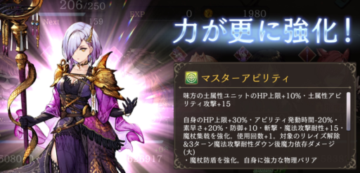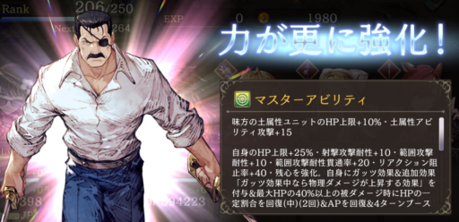 ![]() 味方の土属性ユニットのHP上限+10%・土属性アビリティ攻撃+15 自身の射撃攻撃耐性+10、範囲攻撃耐性+10 ⇩MA強化⇩ 味方の土属性ユニットのHP上限+10%・土属性アビリティ攻撃+15 自身のHP上限+25%・射撃攻撃耐性+10・範囲攻撃耐性+10・範囲貫通+20・リアクション阻止率+40 | ||||