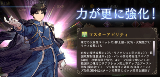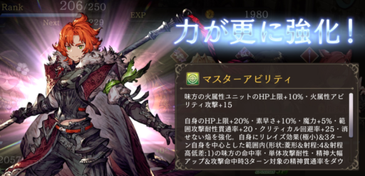 ![]() 味方の火属性ユニットのHP上限+10%・火属性アビリティ攻撃+15 HP上限+20%、自身の素早さ+10%、魔力+5%、範囲耐性貫通+20 ⇩MA強化⇩ 味方の火属性ユニットのHP上限+10%・火属性アビリティ攻撃+15 HP上限+20%、自身の素早さ+10%、魔力+5%、範囲耐性貫通+20・クリティカル回避+25 | ||