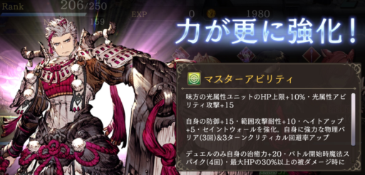 ![]() 味方の光属性ユニットのHP上限+10%・光属性アビリティ攻撃+15 自身の防御+15、範囲耐性+10、ヘイト+5、セイントウォールを強化(軽減効果70%にアップ) ⇩MA強化⇩ 変化なし | ||