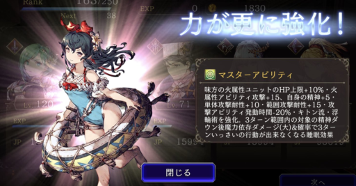 ![]() 精神+5、単体攻撃耐性+10 ⇩ ⇩ 味方の火属性ユニットのHP上限+10%・火属性アビリティ攻撃+15、自身の精神+5、単体攻撃耐性+10、範囲耐性+15、攻撃アビリティ発動時間短縮-20%、LB強化(3ターン対象の精神ダウン後ダメージに) |