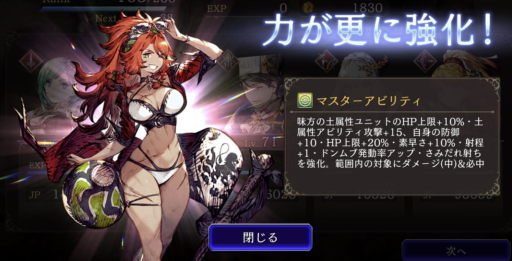 ![]() 素早さ+10%、さみだれ射ちが必中に ⇩ ⇩ 味方の土属性ユニットのHP上限+10%・土属性アビリティ攻撃+15、自身の素早さ+10%、さみだれ射ちが必中に、防御+10、HP+20%、射程+1、ドンムブ発動率アップ(係数+0.25) |