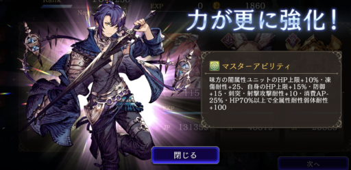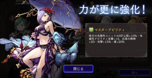 ![]() 味方の光属性ユニットのHP上限+10%・光属性アビリティ攻撃+15、自身の精神+10、攻撃+5% ⇩ ⇩ 味方の光属性ユニットのHP上限+10%・光属性アビリティ攻撃+15、自身の精神+20、攻撃+15%、運+20% |