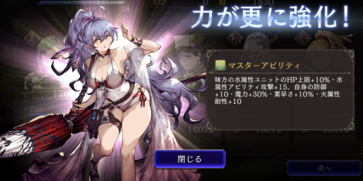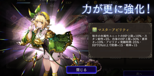 ![]() 味方の水属性ユニットのHP上限+10%・水属性アビリティ攻撃+15、自身の魔力+15%、火属性耐性+10 ⇩ ⇩ 味方の水属性ユニットのHP上限+10%・水属性アビリティ攻撃+15、自身の防御+10、魔力+30%、素早さ+10%、火属性耐性+10 |