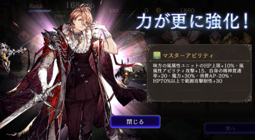 ![]() 精神貫通率+20、魔力+10% ⇩ ⇩ 味方の風属性ユニットのHP上限+10%・風属性アビリティ攻撃+15、自身の精神貫通率+20、魔力+30%、消費AP-20%、HP70%以上で範囲耐性+30 |