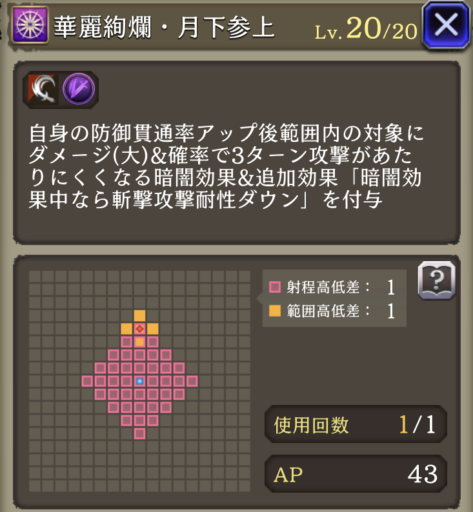 ![]() | 【EX】 AP+20 斬撃貫通+40 リアクション阻止率+50% HP20%以下でMAXの50%回復 | 9 | 2 |