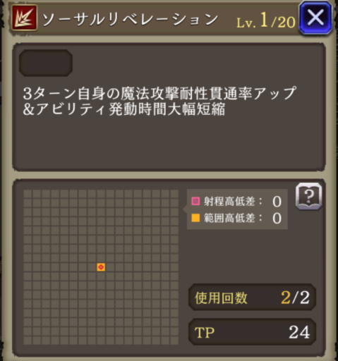 | JobLv19 ソーサリースフィア強化 | 命中+30追加、射程高低差+1 |