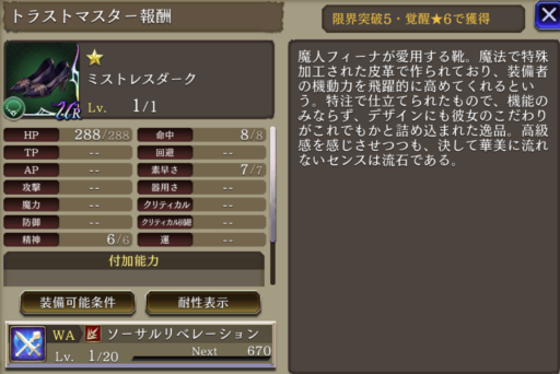 | 付加効果 | 命中アップ15 魔法攻撃アップ15 ソーサリーストライク強化 リアクション発動率100ダウン追加 |