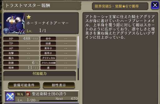 ![]() | セイントウォール 物理50%軽減バリア クリティカル回避+15 | 4 | |
