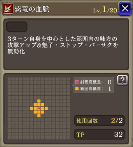 | 紫竜回避 | 物理攻撃を確率で回避&3ターン自身の攻撃+30% |