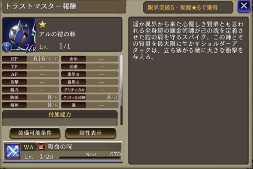 ナイトの心得 | HP上限+15%、斬撃攻撃貫通率+40 |