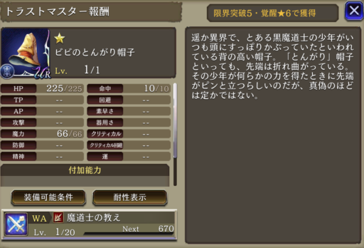 魔道士の加護 | 魔法耐性+15、精神+12 |