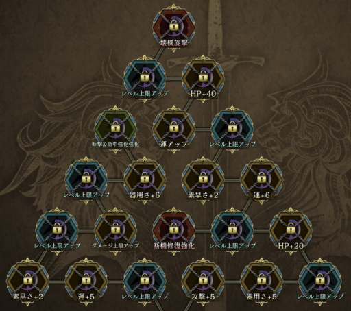 斬撃&命中強化 ↓ 斬撃&命中強化:改 | 斬撃耐性貫通+40、命中+25 ↓ 斬撃耐性貫通+40、命中+25、攻撃+24%、消費AP25%ダウン |