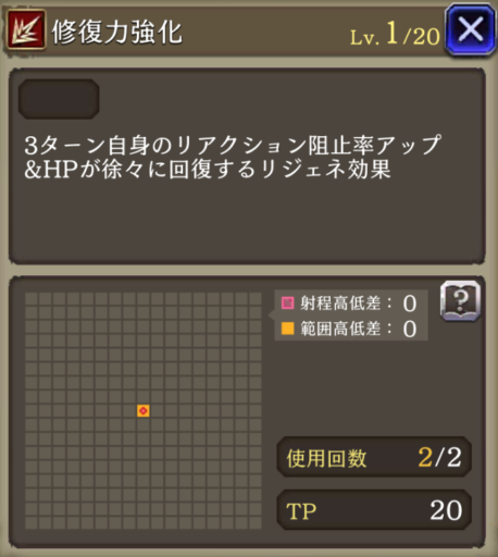 オートリペア | 範囲耐性+15、HP70%以下で非ダメージ行動時にHP一定割合回復(大)(1回) |