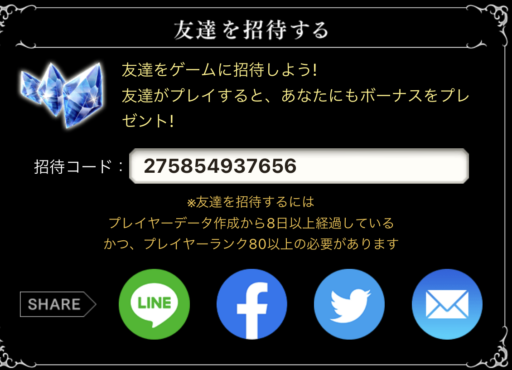 ⇩招待するときはこの画面から各種メディアを使って招待コードを送ることが可能です。