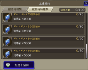 招待を受ける側に用意されたミッションは⇩このようなものがあり、ギルドに所属する必要があるものもあります。(ホーム画面「フレンド」➜「友達招待」から確認)